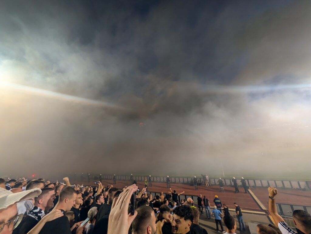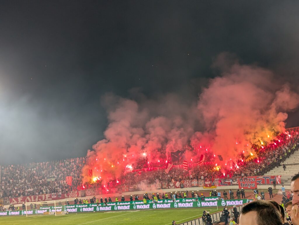Delije von Zvezda zeigte ein Banner mit mythischen vermummten Kämpfern umgeben von kleinen Pappschildern in den Vereinsfarben und dem Schriftzug ,,Wir sind die Stärksten“. Im Intro der Grobari (Partizan) wehten etliche kleine schwarz-weißen Fähnchen im Wind und fast zeitgleich jagte Partizan massiv schwarzen und weißen Rauch in die Luft, vermischt mit vereinzelten Böllern und wenigen Fackeln. Das Spiel ging zwar kurz los und es schien so als trotz etlichen Nebels einfach weitergespielt werden sollte, wurde dann aber doch etwa fünf Minuten unterbrochen. Das komplette Spielfeld und Stadion war eingenebelt und die Partizan Anhänger feierten munter lautstark weiter. Als es weiterging, wurde schnell deutlich, dass Roter Stern die technisch deutlich stärkere Mannschaft ist und das Heft in die Hand nehmen wird.