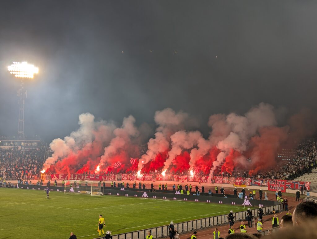 Die Sponsoreinnahmen bei Zvezda sind seit Jahren um ein Vielfaches höher als die des ungeliebten Nachbarn. Aktuell scheint Partizan so große finanzielle Probleme zu haben, dass das aktuelle Team fast nur noch aus Spielern aus der eigenen Jugend besteht. Nach rund einer halben Stunde ging Roter Stern verdient in Führung, die Spielanlage war einfach besser, mit Elsner, Arnautovic oder Veljkovic standen auch sehr bekannte Namen auf dem Feld. Das Tor führte natürlich zu etlichen angerissenen Fackeln im Gästeblock, die kurze Zeit später noch eine geordnete Rauchshow in Rot/Weiß darbot, auch das sah sehr ordentlich aus.