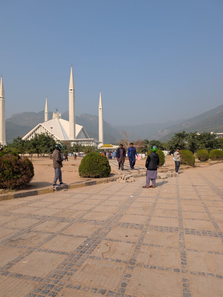 Nach kurzen vier bis fünf Stunden Schlaf hieß es unsere direkte Umgebung im F10-4 zu erkunden. Islamabad ist eine Planstadt aus den 70ern und ziemlich quadratisch aufgebaut. Wohnanlagen wurden außen herum um eine ,,Einkaufsmeile“ pro Viertel herumgebaut, dazu riesige Parkanlagen die die Stadt ziemlich grün erscheinen lassen. Ein Negativpunkt ist, dass alles auf Autos ausgelegt ist. Bis auf die Einkaufsstraßen ist nichts fußläufig erreichbar und alle sind auf mindestens zwei Räder angewiesen. Für uns als Touristen kein Problem, denn Taxis (App Empfehlung: InDrive, nur Bargeld!) kosten nichts. Eine halbe Stunde Fahrt kostet weniger als fünf Euro – da fragt man sich schon, was bei den Fahrern noch herausspringt.