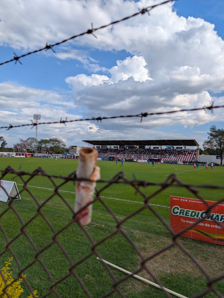 Als wir 30 Minuten vor Anpfiff ankamen, war der viel zu eng gebaute Parkplatz schon so gut wie voll. Gut, dass hier jeder Zweite ein SUV (inkl. uns) fährt, aber die örtlichen Polizeibeamten halfen bei Ein- und Ausfahrt. Der Ground selbst besteht auf einer Torseite aus einem kleinen Restaurant mit Blick auf das Feld und auf einer Längseite aus einer langen Stehtribüne. Diese unterteilt in einen gut gefüllten Gästeblock und dem Heimbereich. Bei solch einem Underdog-gegen-Goliath Spiel waren die Terrassen gut von den Locals gefüllt. Wir als Gringos fielen natürlich wieder maximal auf, die Umstehenden waren auch hier freundlich und auch sehr interessiert und ich versuchte, deren Fragen zu beantworten.