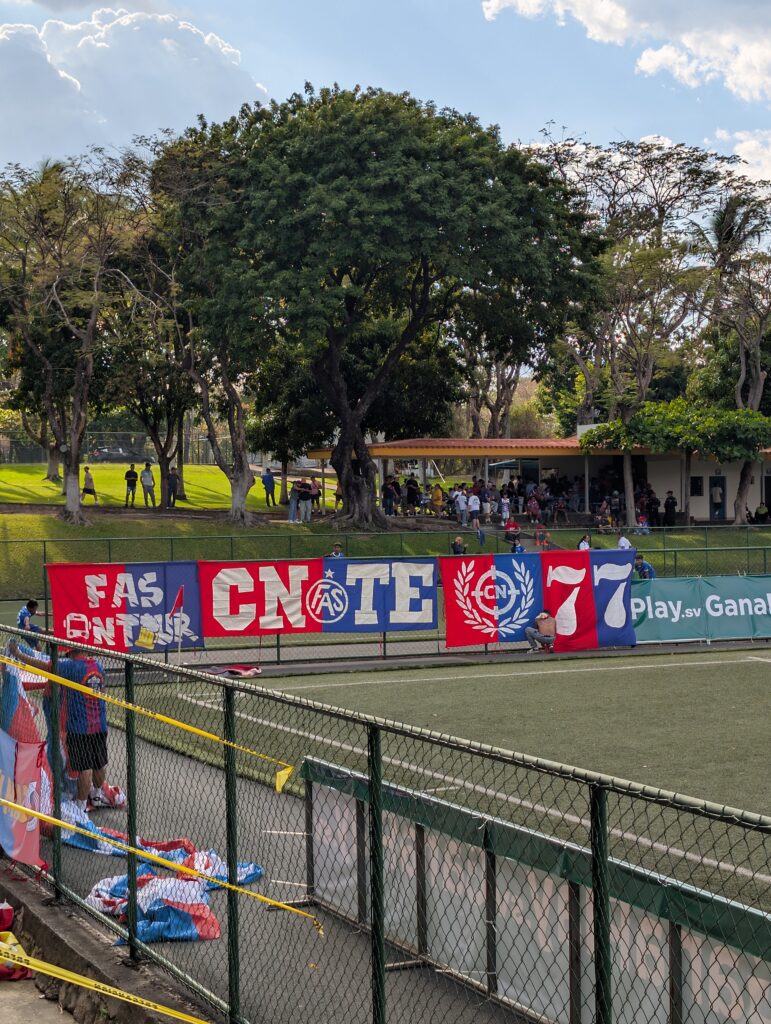 Es ist wahrlich immer beruhigend, wenn der Länderpunkt früh fällt und es zudem Tickets online über den Link des Instagram Accounts des Vereins zu kaufen gibt. Vor Ort habe ich übrigens keinen Verkauf gesehen, allerdings 1-2 Personen, die welche aus der Hand angeboten haben. Alianza ist mit FAS aus Santa Ana der größte Verein des Landes und darf demnach auch im größten Stadion spielen. 53.000 Plätze sind schon eine Hausnummer, insbesondere bis zu 3400 Logen (!), welche auch immer reichen Salvadorianer diese füllen sollen. Trotz der Beliebtheit waren es heute, wie sonst auch (Ausnahme die Topspiele und Derbys) nicht viel mehr als 1 % die im weiten Rund anwesend waren. Eine kleine bara brava gab es auf der Gegengerade, der Zaun auch mit einigen Bannern beflaggt, waren sie durchaus öfter zu hören, auch mit musikalischer Untermalung – aber in diesem Stadion kann es nicht sonderlich enthusiastisch bei einem ankommen. Auf dem Feld dominierte die Heimmannschaft lange und führte auch verdient 2:0, um durch zwei absolut haarsträubende Fehlpässe, spät den Ausgleich zu kassieren. Also wirklich haarsträubend – wie die komplette Mannschaft bei einer 2:1 Führung aufrückt und der Vorletzte Mann dann einen Alleingang versucht, wäre in Deutschland aufgrund fehlender taktischer Disziplin das Karrierenende gewesen.